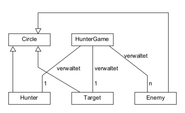 Wir erstellen wieder eine Hauptklasse "HunterGame", von der ein einziges Objekt instanziert wird. Es hält Referenzen auf den Hunter, das Target und die Enemies.