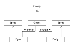 Wir realisieren dies im Programm, indem wir entsprechende Attribute body und eyes der Klasse Sprite in der Klasse Ghost deklarieren und ihnen im Konstruktor entsprechende Objekte zuweisen: