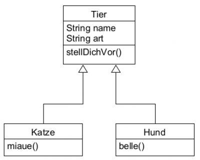 Wir erweitern die Klasse Katze um eine Methode miaue und die Klasse Hund um eine Methode belle: