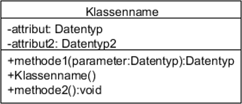 - - (private): Das Attribut/die Methode ist nur innerhalb dieser Klasse sichtbar.