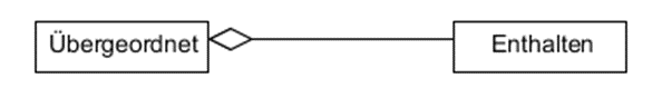 Objekte der Klasse „Übergeordnet“ können Objekte der Klasse „Enthalten“ enthalten (als Referenzattribute). Die Objekte der Klasse Enthalten können aber auch dann weiter existieren, wenn es das übergeordnete Objekt nicht mehr gibt.