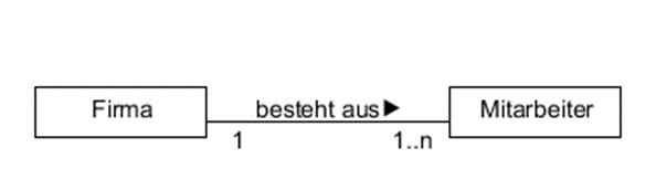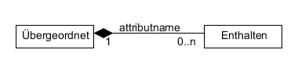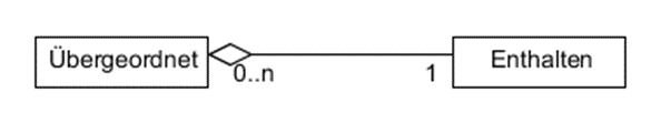 Bedeutung: Ein Objekt der Klasse „Übergeordnet“ enthält immer genau ein Objekt der Klasse „Enthalten“. Ein Objekt der Klasse „Enthalten“ kann in beliebig vielen (n), aber auch in keinem (0) Objekt der Klasse „Übergeordnet“ enthalten sein.