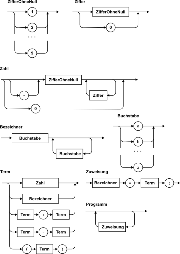 - den Nichtterminalen V = {ZifferOhneNull, Ziffer, Buchstabe, Bezeichner, Term, Zuweisung, Programm}