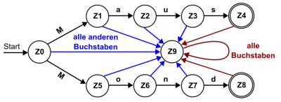 Hier ein Beispiel für einen nichtdeterministischen endlichen Automaten mit dem Alphabet A = {a, b, …, z, A, B, …, Z}, der genau die Wörter Maus und Mond erkennt: